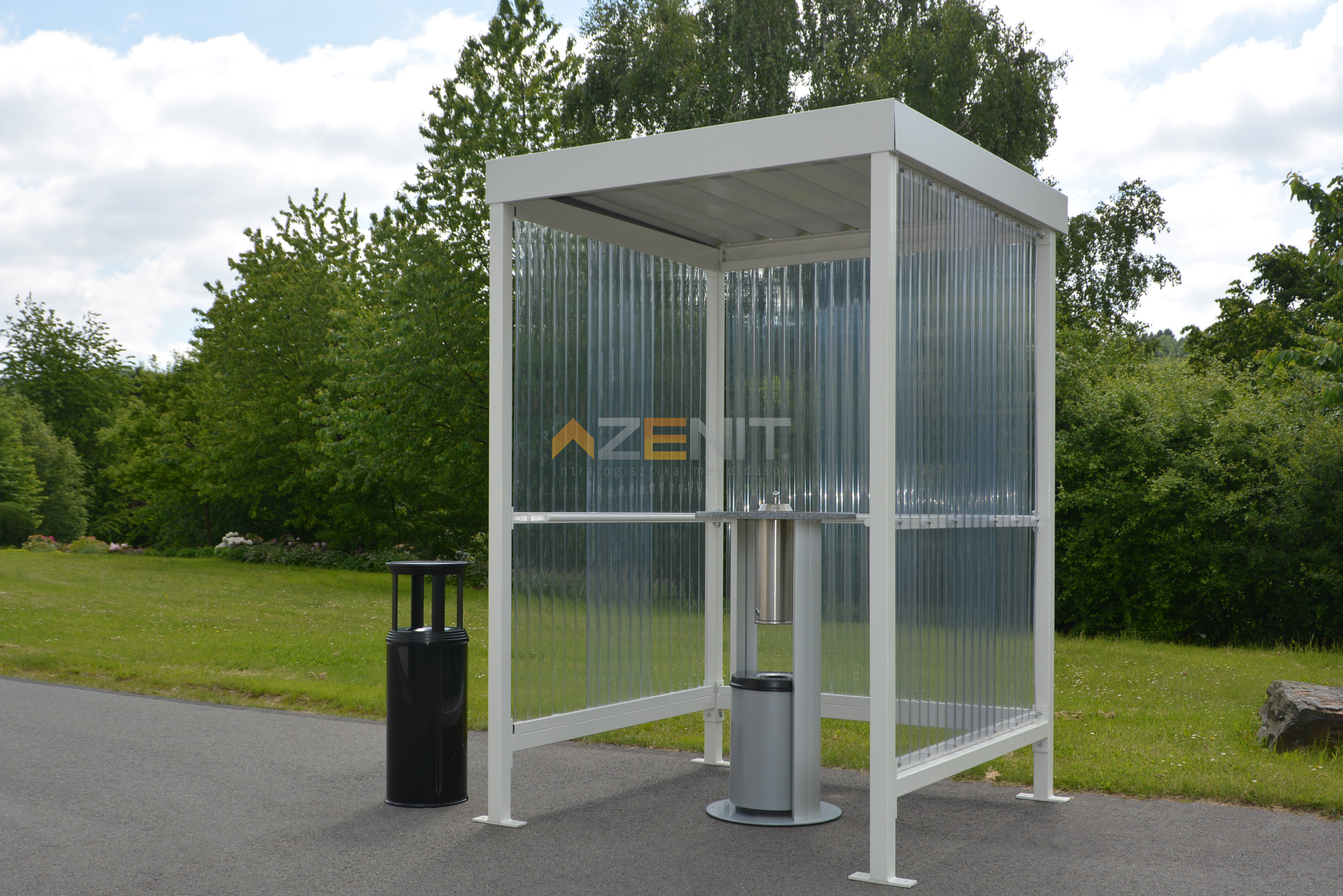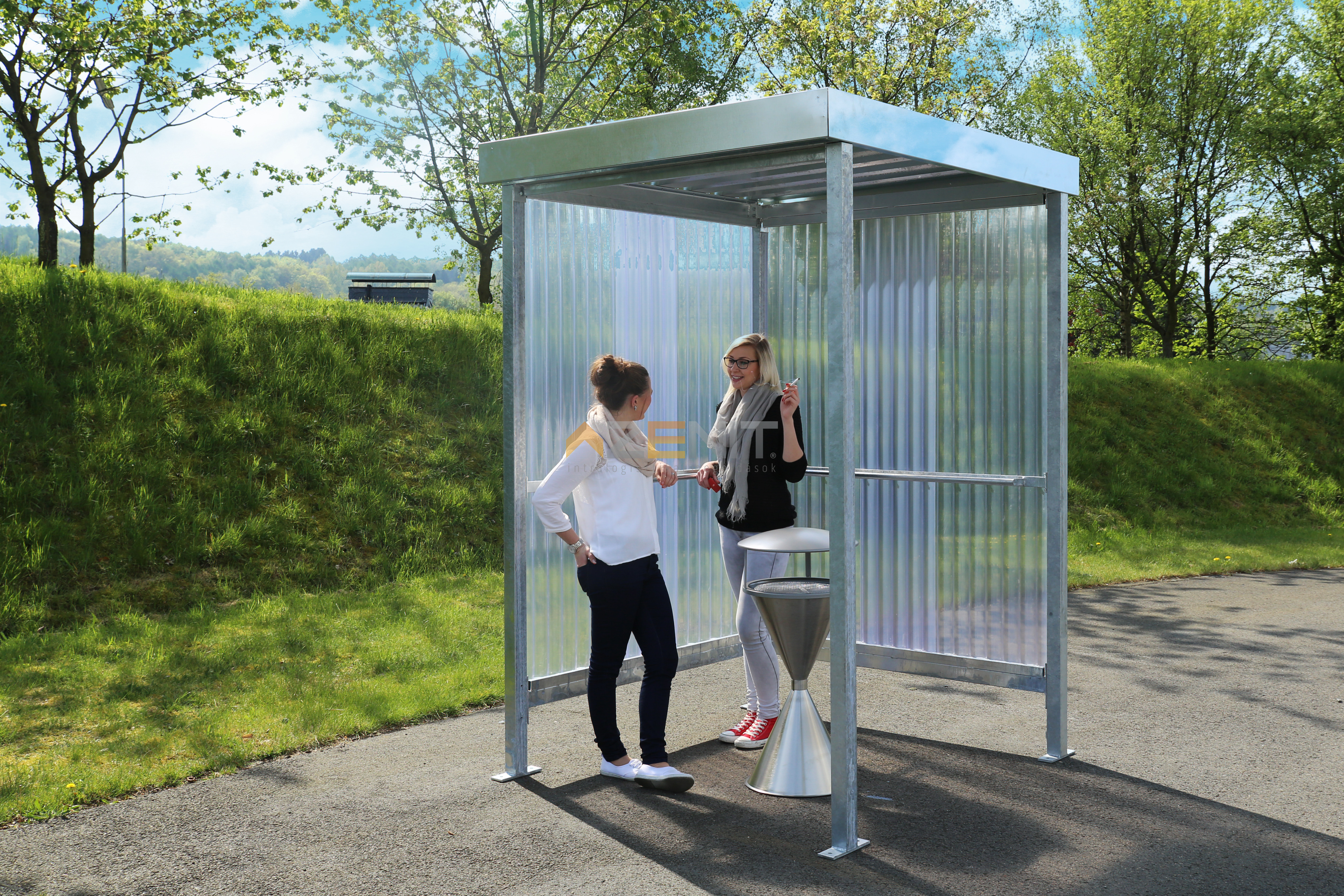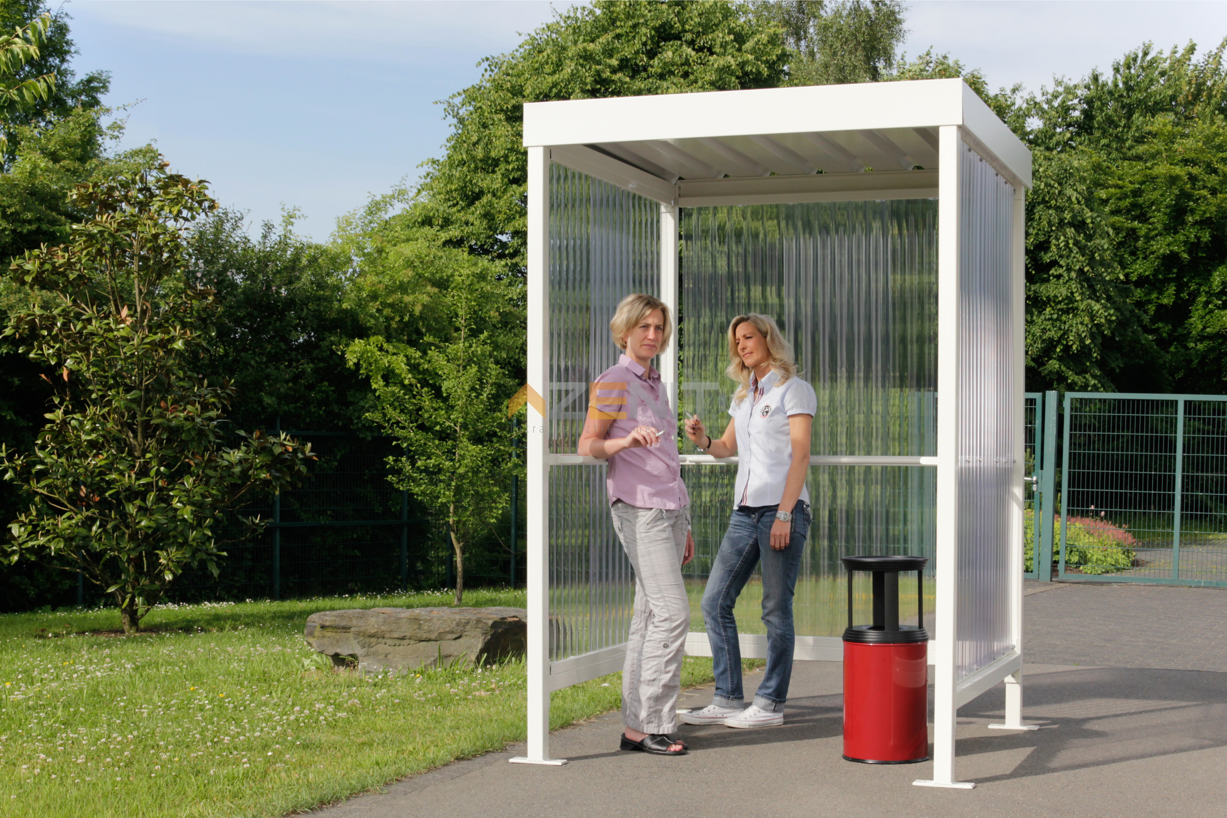 A JENA a dohányosok menedéke: egy olyan dohányzópavilon, amely védelmet nyújt a szél és a hó ellen, mindössze 2,25 négyzetméter alapterületen. A 2 vagy 3 oldalsó elemből készült polikarbonát védőtető rendszer nemcsak védelmet nyújt az időjárás viszontagságai ellen, hanem egy világos, kellemes légkört is biztosít a dohányzók számára.
