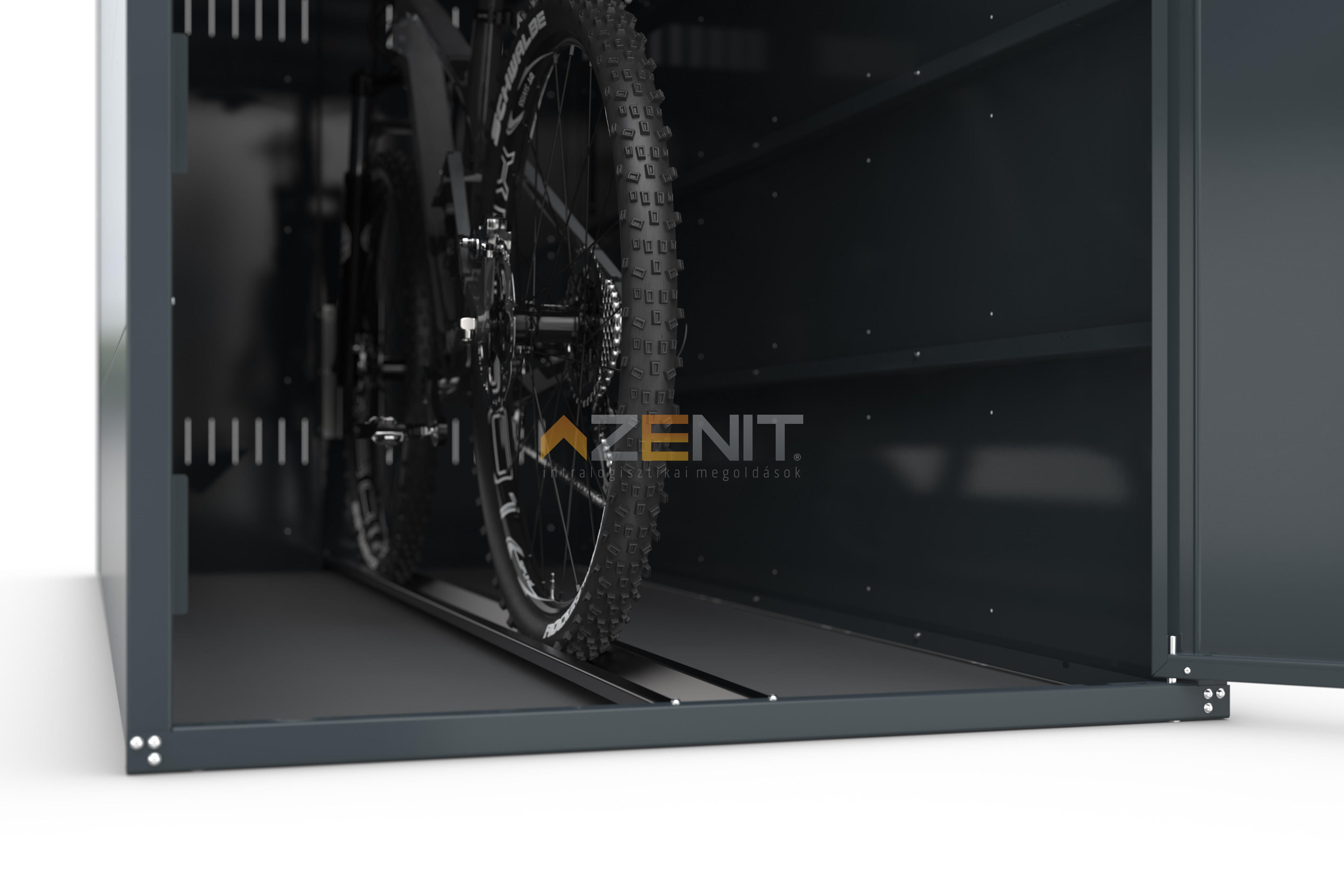Egy bikebox egy darab bicikli tárolására alkalmas, de tetszés szerint bővíthető, akár „sorgarázzsá” is. Acéllemezből készül, RAL 7016 antracitszürke színre fújva. Innovatív formatervezésének köszönhetően tetszetős a megjelenése, apró szellőző lyukakkal ellátott, de kellően robosztus ahhoz, hogy ne tűnjön könnyű célpontnak. Szinte bármilyen típusú kerékpár tárolható ebben a 850×2050×1250 mm méretű dobozban, amibe egy 750mmx1150mm-es ajtón keresztül lehet ki-beparkoltatni kétkerekűnket. Mivel a bikebox hosszan tartó kültéri igénybevételnek is kitehető, felületkezelése tüzihorganyzott, ezért az egész kerékpár garázs korrózió védett. A Zenit Kft. webshopján keresztül a bikebox egydarabos kiszerelési egységekben, lapra szerelve, szerelési útmutatóval együtt rendelhető, így szállítása könnyebb és bárki saját maga is egyszerűen felállíthatja.