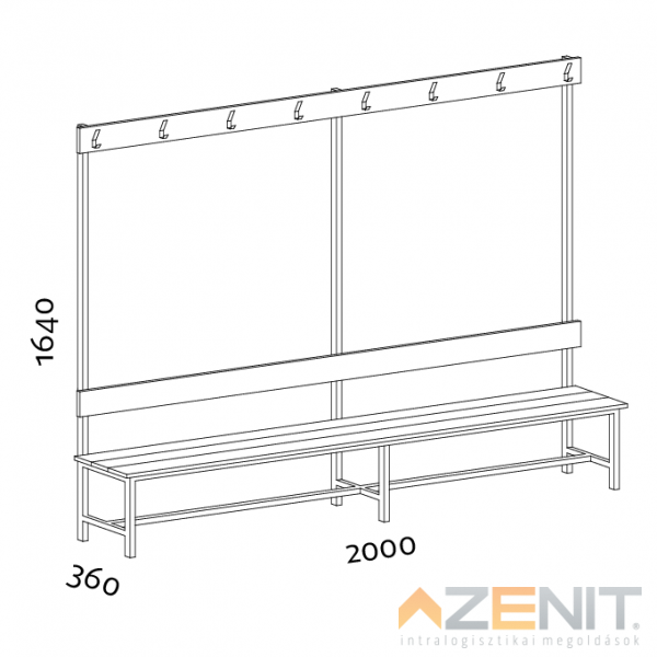 Öltözőpad lécezett háttámlás egyoldalas 2000 mm teljes magasságxmélység 1640x360 mm RAL...